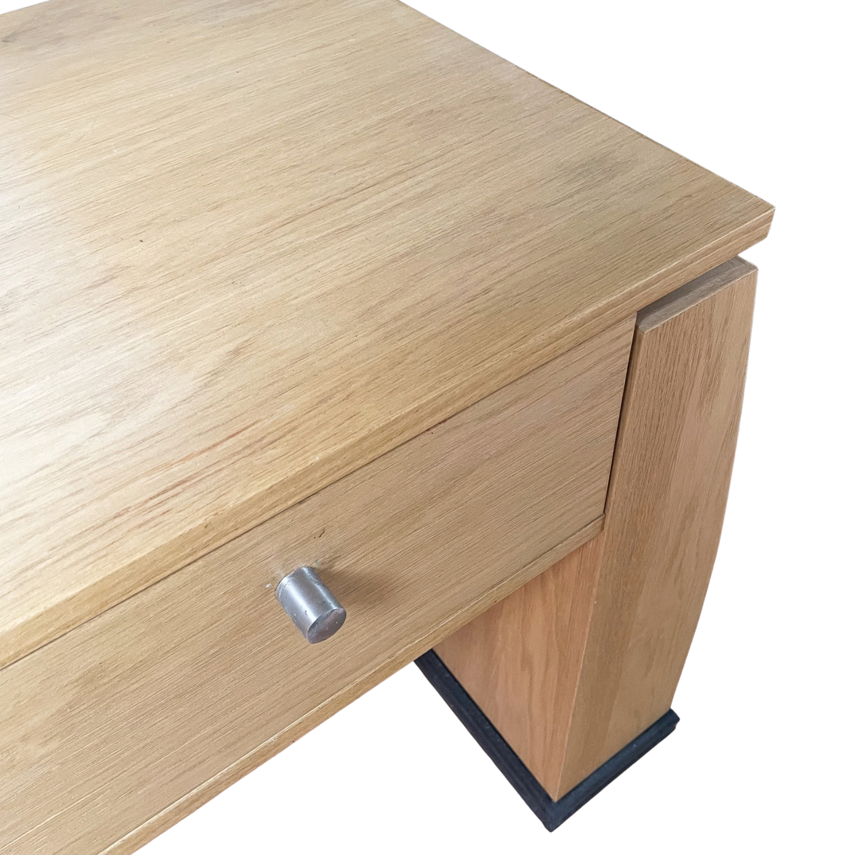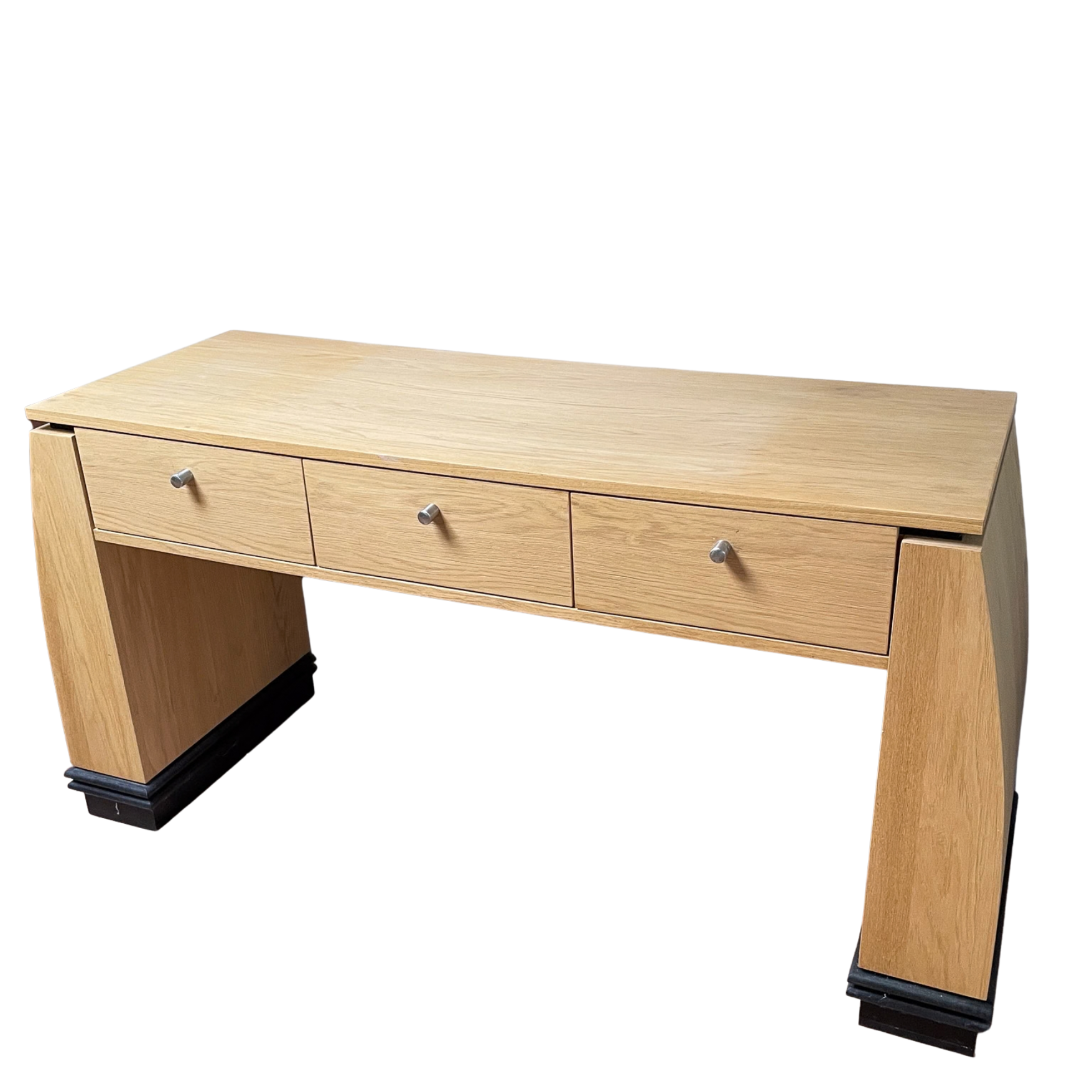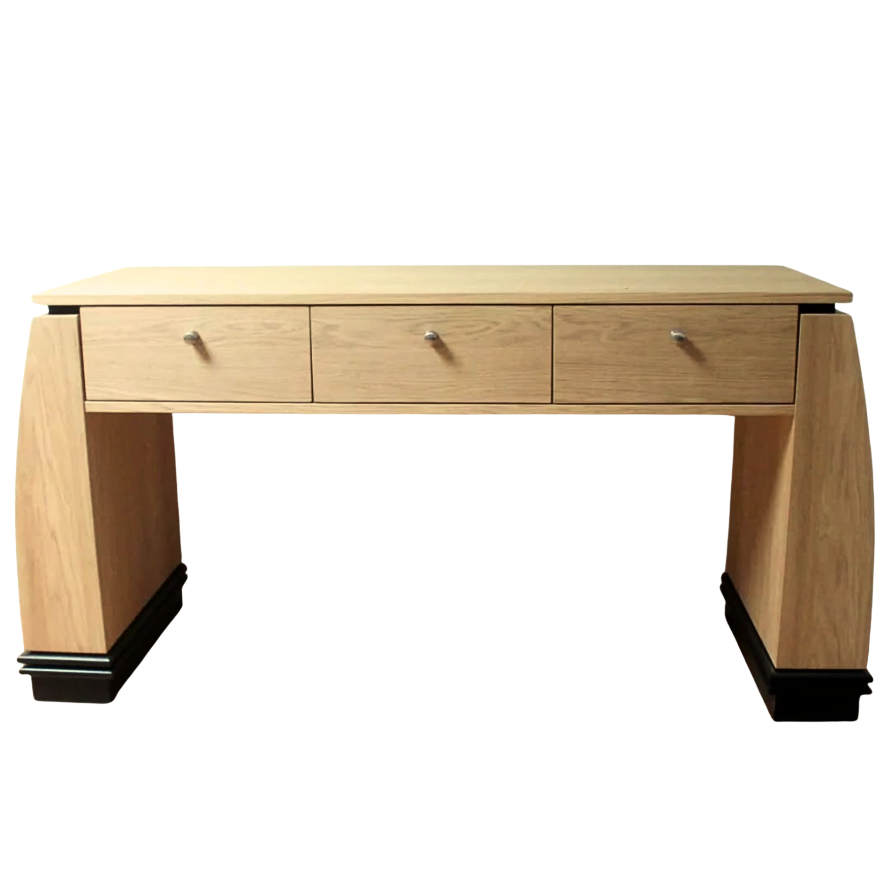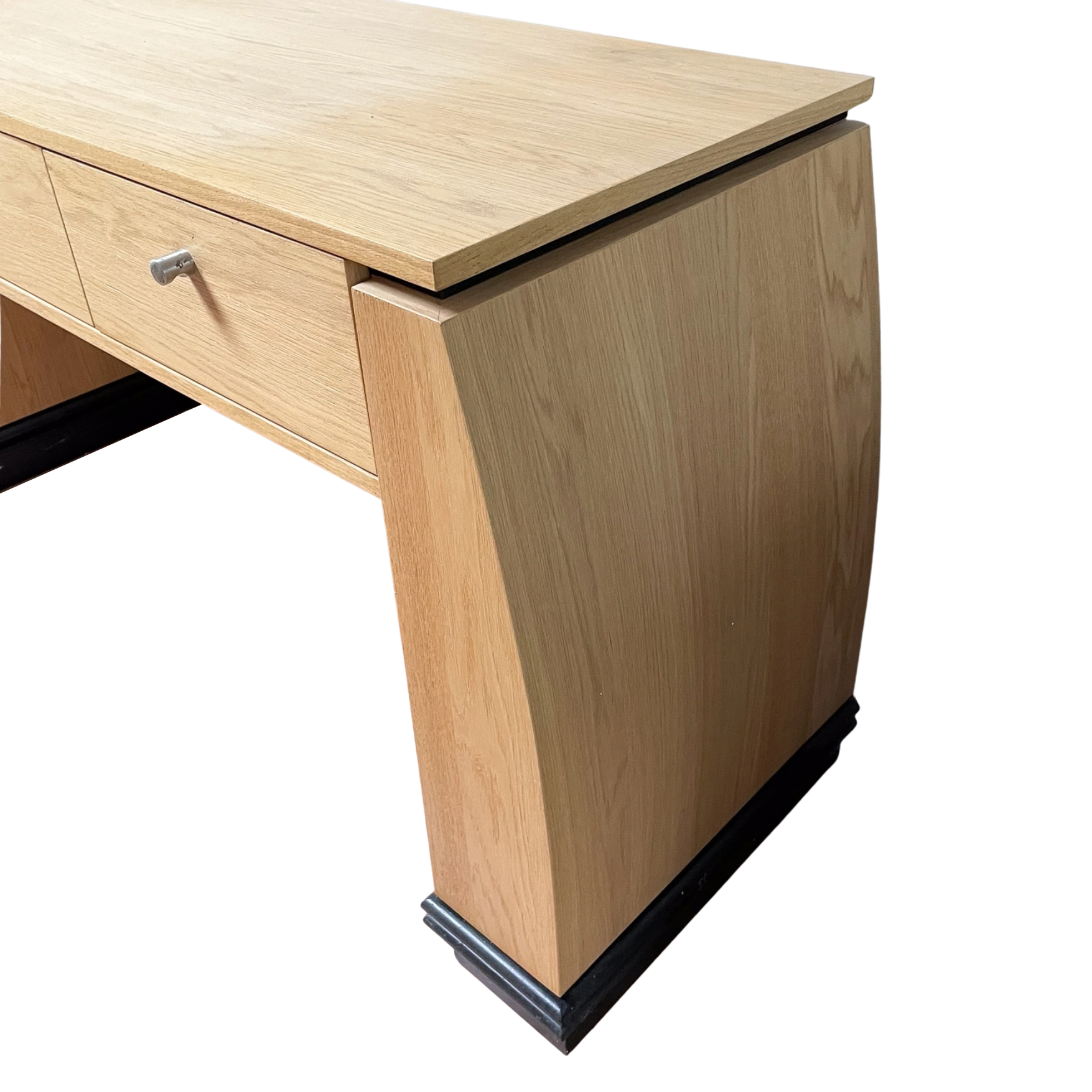 De uitvoering op de foto is gemaakt van eikenhout met zwarte details, wat zorgt voor een elegante en tijdloze uitstraling. Dankzij het Art Deco ontwerp met strakke lijnen en karaktervolle vormen is dit bureau een echte blikvanger in een kantoor, werkkamer of woonkamer.